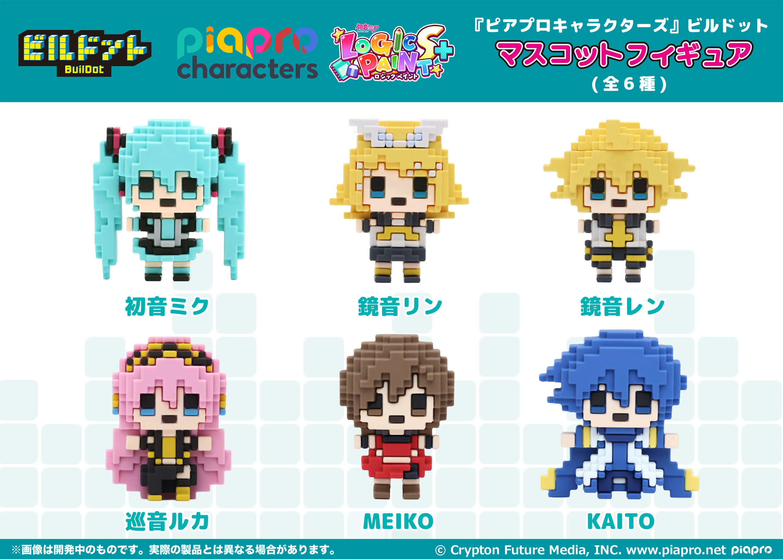 「初音ミク ロジックペイント」より、バーチャルシンガーの「初音ミク」「鏡音リン」「鏡音レン」「巡音ルカ」「MEIKO」「KAITO」がビルドットマスコットフィギュアで登場です。